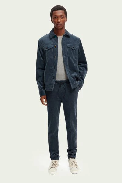 Met deze donkerblauwe Warren broek van Scotch & Soda maak je een stijlvolle en trendy indruk. De Regular-fit pasvorm zorgt ervoor dat de broek recht langs je lichaam valt. De broek is ideaal te combineren met een t-shirt en het bijpassende jack. De set zorgt door de corduroy binding voor een trendy look.