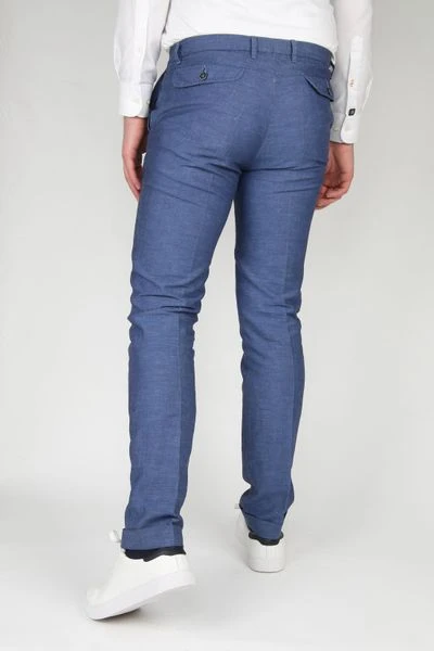 Met deze Pisa Pantalon van Suitable haal je zowel een stijlvolle als een comfortabele herenbroek in huis. De moderne pantalon heeft een blauwe kleur en een subtiel melange dessin. Daarnaast is de broek afgewerkt met een donkere knoop, een ritssluiting, twee steekzakken aan de voorzijde, twee klepzakken met knoopsluiting aan de achterzijde en is voorzien van een stijlvolle omslag.Â